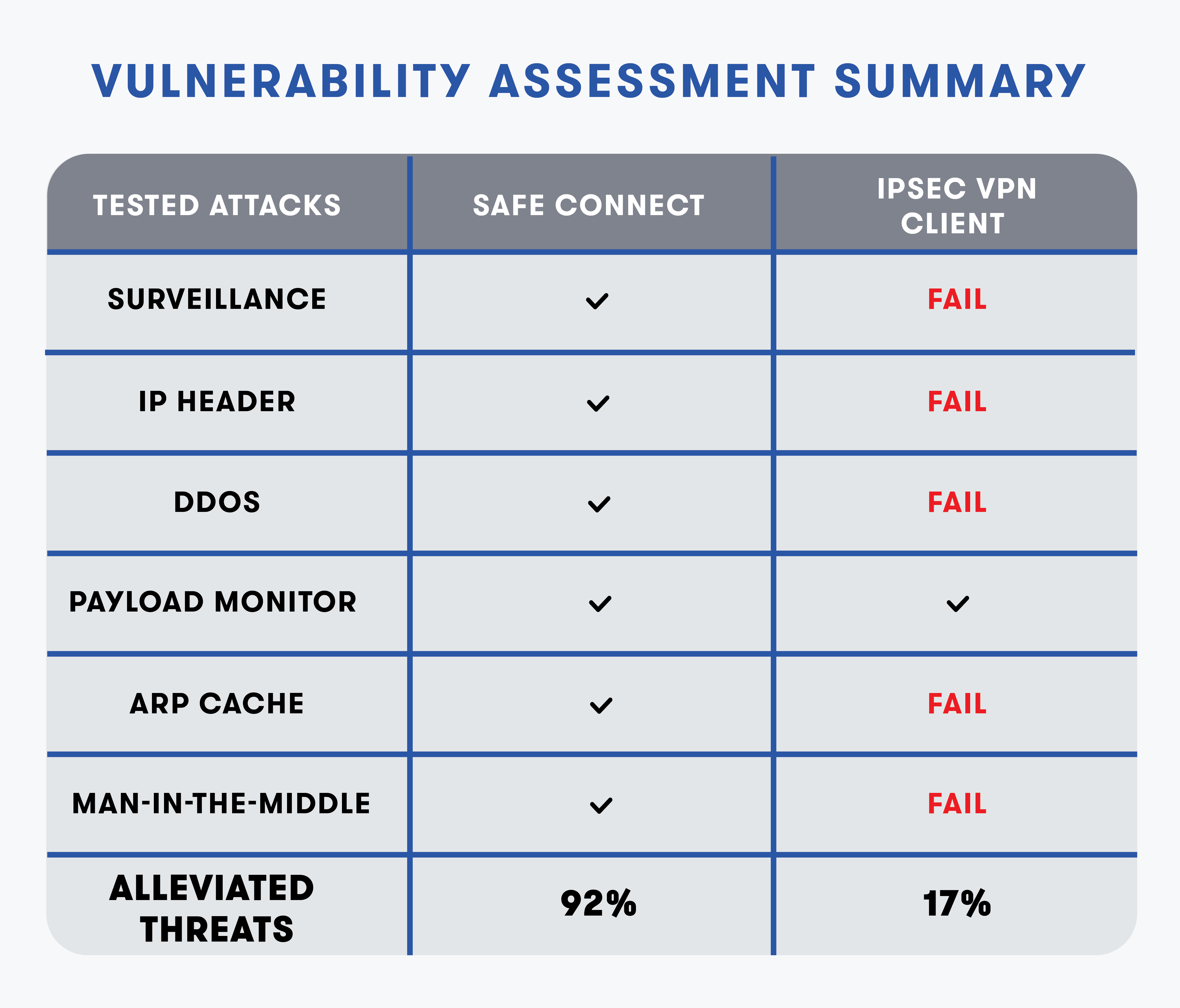 NVIS has significant security advantages vs centralized VPNs (SSL and IPsec) as shown in the independent test of the NVIS app SafeConnect by Miercom Labs.